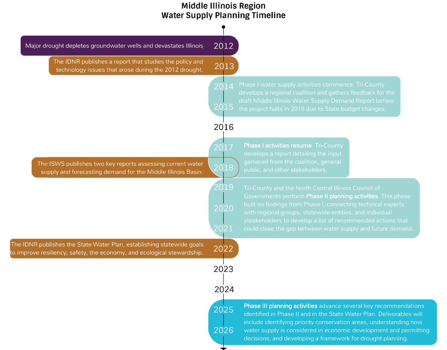 2006-01 directing the Illinois Department of Natural Resources (IDNR) to conduct statewide and regional water supply planning. Carrying out that order, the IDNR partnered with Tri-County and the Illinois State Water Survey (ISWS) in 2014 to begin regional water supply planning in the Middle Illinois Basin spanning LaSalle, Livingston, Marshall, Peoria, Putnam, Stark, and Woodford Counties.